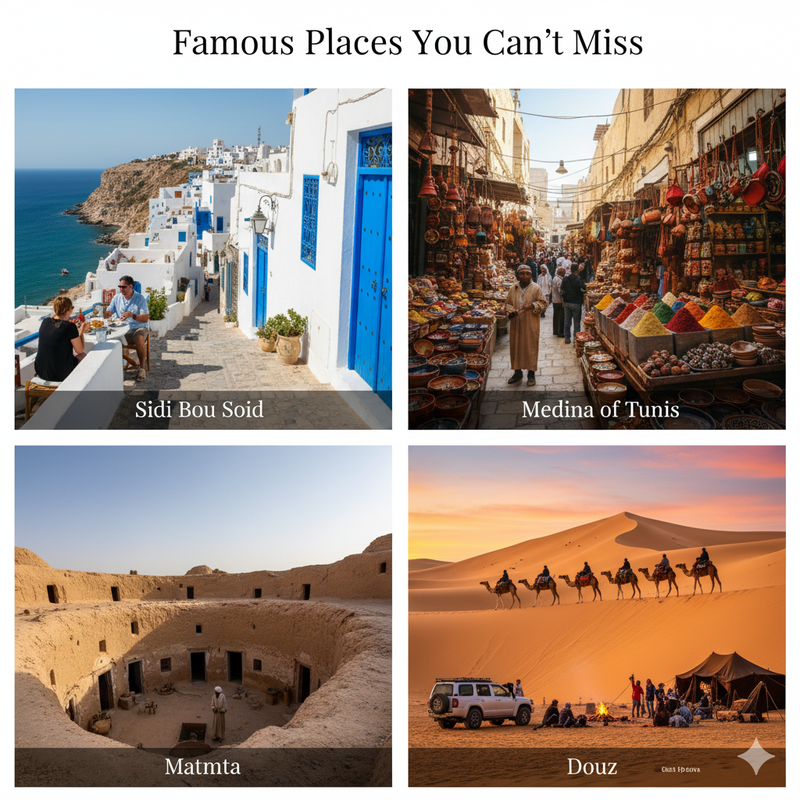 - Try the Food: Tunisian cuisine is a highlight—don’t miss couscous, brik (fried pastry with egg or tuna), and harissa, a spicy chili paste that flavors many dishes.